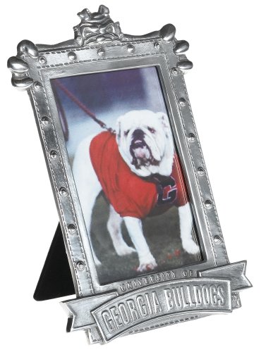 A perfect way to proudly celebrate your almamater, this University of Georgia picture frame features a handsome metal alloy frame with University of Georgia Bulldogs in block letters across the bottom, and a whimsical, decorative bulldog seemingly climbing up the back of the frame and holding on, looking over the top. The glass insert accommodates your most favored 4 X 6 inch picture.