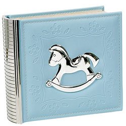 Our Rocking Horse by Photo Album by Elegant Baby comes complete with silver plated bindings and embossed leather covers. The Rocking Horse Design has a soft blue leather cover and a silver plated rocking horse emblem on the front. It holds (80) 4" x 6" photographs and measures 7"x 8"x 2".