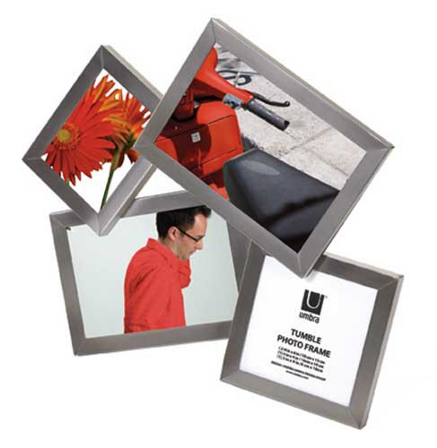 Designed by the Umbra Design Group, this multi opening desktop frame is fresh and perfect for the home and office! The Tumble holds 4 photographs or prints: one 3 X 4", one 4 X 4" and two 4 X 6" photographs or prints. Brushed chrome finish. Includes glass covers. By Umbra. Umbra is the worldwide leader in casual, contemporary and affordable design for the home. They have a strong commitment to making a positive and sustainable contribution to the realm of fiscal, social and environmental responsibility.