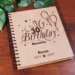 Engraved 30th Birthday Memories Photo Album Our Engraved Birthday Memories Photo Album will cherish memories for years to come. Fill your Engraved Birthday Photo Album with all of your favorite photos from this special, milestone birthday party. Our Personalized Wood Photo Album measures 7 2/3" x 8 3/4" and holds 72, 4 x 6 photos. Includes FREE Personalization! Personalize your Birthday Photo Album with any age, name, birth year and milestone year. (i.e. 30th\Renne79-2009)