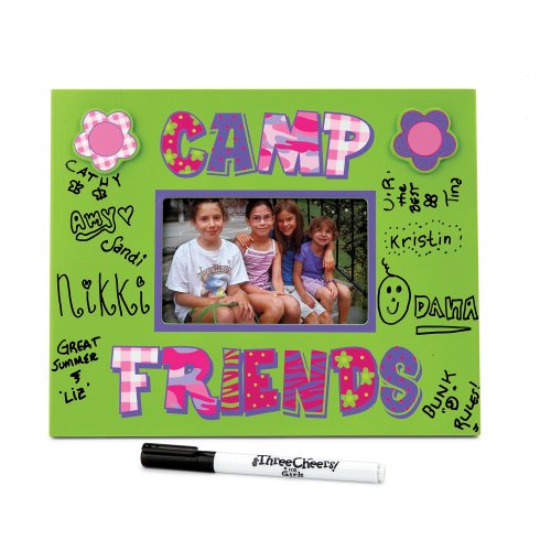 Autographs are all the rage at camp and this Camp Friends Autograph Photo Frame by Three Cheers for Girls has it all! Combine all the best wishes from your best friends with a great camp photo. This fantastically girly frame holds one photo of all your camp friends and features a super large area for their autographs and witticisms. The perfect way to preserve your favorite camp shot along with thoughts from bunk mates, this unique wood frame allows everyone to sign for everlasting memories. The frame is decorated with 2 wood flower cut-outs and is titled Camp Friends in fun block letters, each letter with a different design. The frame holds 1- 4x6 photo and includes a permanent marker for signatures.
