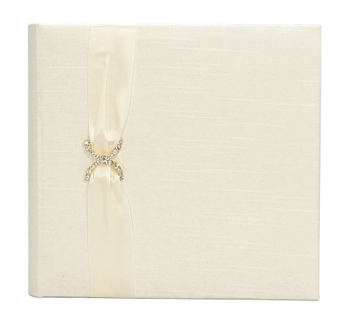 This wedding album features a rich tone on tone soft damask pattern adorned with a beautiful satin ribbon and jewels in half circles symbolically joined together. Comes with an attractive box for protection and is perfect for gift giving. Sleeved pages makes for easy placement of photos. It holds 2 4-inch by 6-inch photos per page, or 1 5-inch by 7-inch per page.