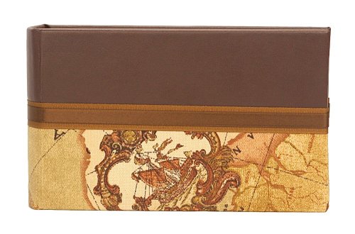 This travel photo album features a classic old world map in fabric and brown faux leather. Album is embellished with a grosgrain ribbon layered with a satin accent ribbon. Comes with an attractive box for protection and is perfect for gift giving. Sleeved pages makes for easy placement of photos. It holds 1 4-inch by 6-inch photo per page.