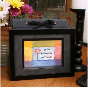 A reflective, happy message conveyed on a brightly colored background. Comes in a black finish with the black suede matte surrounding the image.