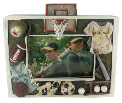 This high detail sports picture frame features a basketball hoop with real rope net, baseball, soccer, and football, surrounding a 3"x5" photo. Opening the box reveals an album that holds 60 photos. The back of the box is solid green, and also allows viewing of the back of the album. Product Dimension: 8"x 6"x 2.5"